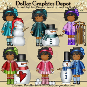 Questa collezione comprende sei adorabili bambine, che indossano graziosi vestiti e fiocchi per capelli, in acqua, rosa, viola, rosso, verde e blu, graziosi pupazzi di neve con cappelli e sciarpe invernali, un cuore rosso, palle di neve e una slitta di legno. Questo set contiene 6 grafici.