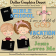 Questa raccolta include un ragazzino con una Bibbia, una bambina con una Bibbia, una bella croce floreale, una Bibbia e quattro grafici con parole cristiane: "Scuola biblica", "Sono un figlio di Dio", "Scuola biblica per le vacanze". "e" Gesù mi ama ". Questo set contiene 8 grafici.