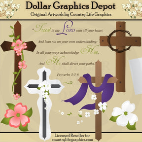 Questa collezione comprende quattro bellissime croci: una con fiori di corniolo rosa, una con fiori di corniolo bianchi, una con una sciarpa viola e fiori di corniolo bianchi e una con una corona di spine, un bel fiore di corniolo rosa, un bel fiore di corniolo bianco, un Carta con sfondo grigio e bianco da 8,5" x 11" e un'immagine grafica con parole scritturali: "Confida nel Signore con tutto il tuo cuore e non appoggiarti alla tua comprensione; Riconoscilo in tutte le tue vie ed egli dirigerà i tuoi sentieri. Proverbi 3:5-6." Questo set contiene 8 grafici.