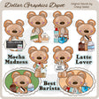 Questa collezione include adorabili orsetti baristi con un cartello sulla lavagna che recita: "Offerte speciali del giorno", un barattolo per le mance, un sacchetto di caffè macinato, una brocca di latte, barattoli di panna montata, una tazza di caffè con la scritta "I Love Coffee" , un sacchetto di chicchi di caffè, sciroppo di cioccolato, un cartone di latte di soia, una tazza di caffè da asporto con agitatore, un caffè freddo da asporto con cannuccia e una tazza di caffè caldo con la scritta "Best Barista word art, due baristi coordinati" cornici per orsi e tre grafiche di word art per il caffè: "Mocha Madness", "Latte Lover" e "Best Barista". Questo set contiene 11 grafiche.