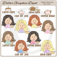 Questa ampia collezione comprende quattro belle signore con tazze di caffè, quattro belle signore con tazze di caffè e parole artistiche da caffè e quattro grafiche di parole artistiche da caffè: "Latte Cafe", "Cup Of Joe", "Java Cafe" e "Caffè." Questo set contiene 12 grafici.