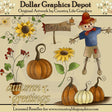 Questa collezione include uno spaventapasseri autunnale, imbottito di paglia, che indossa una camicia blu, pantaloncini marrone chiaro e un cappello arancione bruciato, bellissimi girasoli gialli, zucche autunnali arancioni e bianche, una bella pianta in vaso con fiori rossi, un cartello con una zucca con la scritta "Zucche" 5 ¢", uno sfondo con girasole e un'immagine word art "Saluti d'autunno". Questo set contiene 9 grafici.