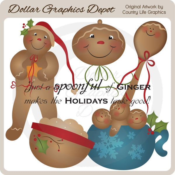 Questa collezione include un omino di pan di zenzero di Natale, una faccia di pan di zenzero, un cucchiaio di pan di zenzero, una ciotola festiva piena di miscela di pan di zenzero, una tazza di fiocchi di neve piena di omini di pan di zenzero e la scritta "Solo un cucchiaio di zenzero rende buone le vacanze". Questo set contiene 6 grafici.