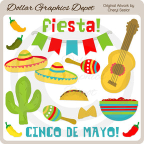 Questa vasta collezione comprende maracas, sombreri, peperoncini, una ciotola di salsa, patatine, un taco, un cactus, una chitarra, uno stendardo e due grafiche word art: "Fiesta" e "Cinco De Mayo". Questo set contiene 16 grafici.