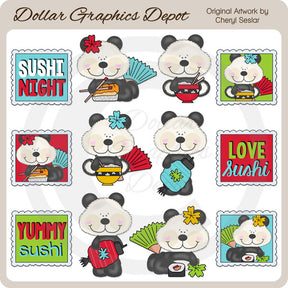 Questa ampia collezione comprende adorabili orsetti panda, graziosi fiori, rotoli di sushi, bacchette, ciotole di riso, lanterne di carta, ventagli colorati, tre cornici panda coordinate e tre cornici word art coordinate: "Sushi Night", "Love Sushi" e "Buonissimo Sushi". Questo set contiene 12 grafici.