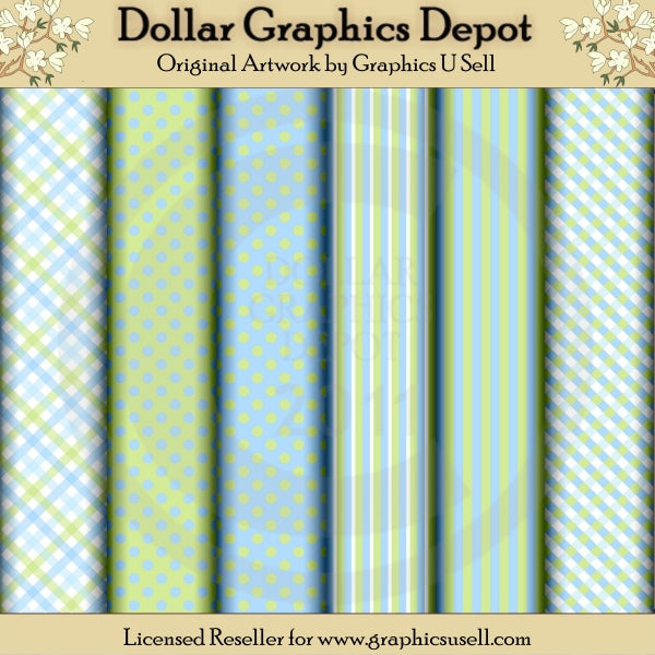 Questa collezione comprende sei carte color pastello da 12 "x 12". I modelli includono: plaid, pois, strisce e percalle. I colori includono: blu, verde e bianco. Questo set contiene 6 fogli di scarto.
