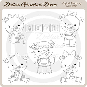 Questa collezione comprende cinque adorabili maialini da bambina con graziosi fiocchi, copri pannolini, bavaglini e biberon e una grafica word art a blocchi per bambini "GIRL". NOTA BENE: questo set si coordina con la collezione "Baby Girl Piggies - Clip Art" . Questo set contiene 6 timbri digitali.