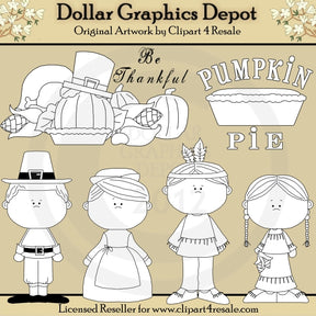 Questa collezione include un ragazzo pellegrino che indossa un abito e un cappello da pellegrino, una ragazza pellegrina che indossa un bel vestito e un cappello, un ragazzo indiano che indossa una camicia di pelle di daino, leggings, mocassini e una fascia di piume, una ragazza indiana che indossa un abito di pelle di daino e mocassini, una torta di zucca con la scritta "Torta di zucca" e un tacchino del Ringraziamento, pannocchie di mais, zucche, patate dolci, mele, torta di zucca e cappello da pellegrino, con la scritta "Sii grato". Questo set contiene 6 timbri digitali.
