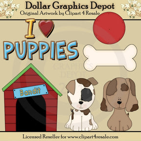 Questa collezione unica nel suo genere è disponibile solo presso Digital Craft Supplies. Questo set include un cucciolo di cane beige con macchie nere, marroni e kaki, un cucciolo di cane marrone chiaro con macchie marroni, una cuccia dipinta, un osso di cane, una palla rossa e una grafica word art "I Love Puppies". Questo set esclusivo contiene 6 grafiche.