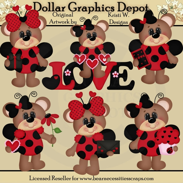 Questa collezione unica nel suo genere è disponibile solo presso Digital Craft Supplies. Questo set include sei adorabili orsetti coccinella, con graziosi fiocchi per capelli, un regalo incartato, la scritta "Amore", piccoli cuori rosa che compongono la scritta: "Ti amo", un biglietto di auguri con la scritta "Amore", un cuore smerlato, un un bel fiore rosso, una busta con adesivi a forma di cuore e un cupcake glassato con caramelle a forma di cuore e una piccola coccinella. Questo set esclusivo contiene 6 grafiche.