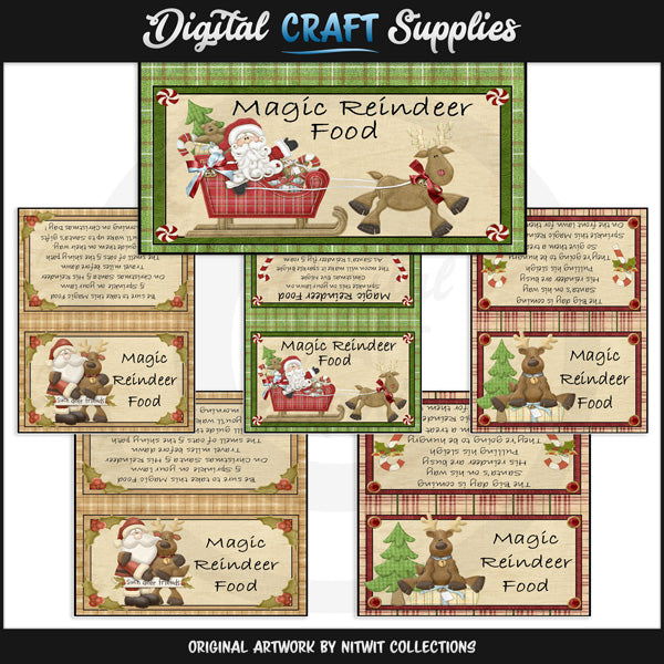 Questa collezione unica nel suo genere è disponibile solo presso Digital Craft Supplies. Questa collezione include sei decorazioni per borse da 3" x 4", in tre diversi modelli (si adattano alle borse artigianali da 3" x 4") e sei decorazioni per borse da 4" x 4", in tre diversi modelli (si adattano alle borse da 4" x 4") borse artigianali da 6 pollici). I disegni includono: plaid marrone chiaro, sfondi rossi e verdi, foglie di bacche di agrifoglio, caramelle alla menta piperita, bastoncini di zucchero, bottoni di rubino, Babbo Natale, slitta di Babbo Natale piena di dolcetti, renne, alberi di Natale e regali di Natale. Il testo include: "Cibo magico per le renne" e tre poesie separate: "Assicurati di prendere questo cibo magico e di cospargerlo sul tuo prato. A Natale, Babbo Natale e le sue renne viaggiano per chilometri prima dell'alba. L'odore dell'avena e il sentiero lucido li guideranno "Il grande giorno sta arrivando, Babbo Natale sta arrivando. Le sue renne sono impegnate a trainare la sua slitta. Avranno fame, quindi dagli un regalo. Cospargi questo cibo magico per le renne sul prato davanti a casa perché possano mangiarlo," e "Cospargilo sul tuo prato la notte della vigilia di Natale. La luna lo farà brillare luminoso. Mentre le renne di Babbo Natale volano e vagano, questo le guiderà a casa tua. E la mattina quando ti alzerai, sotto il tuo albero ci sarà una sorpresa!" Questo set esclusivo contiene 6 stampabili individuali e 8 pagine "Pronte per la stampa" (non mostrate nell'anteprima).