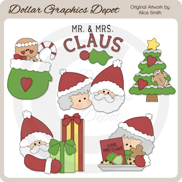 Questa collezione unica nel suo genere è disponibile solo presso Digital Craft Supplies. Questo set include Mr. e Mrs. Claus, Babbo Natale con regali di Natale incartati, Mrs. Claus con un vassoio pieno di biscotti di Natale decorati e una cartolina di Natale con la scritta "Love, Mrs. Claus", un guanto natalizio con un bastoncino di zucchero e un simpatico omino di pan di zenzero, un albero di Natale decorato con una stella dorata in cima e una grafica word art "Mr. e Mrs. Claus" con una foglia di bacca di agrifoglio. Questo set esclusivo contiene 6 grafiche.