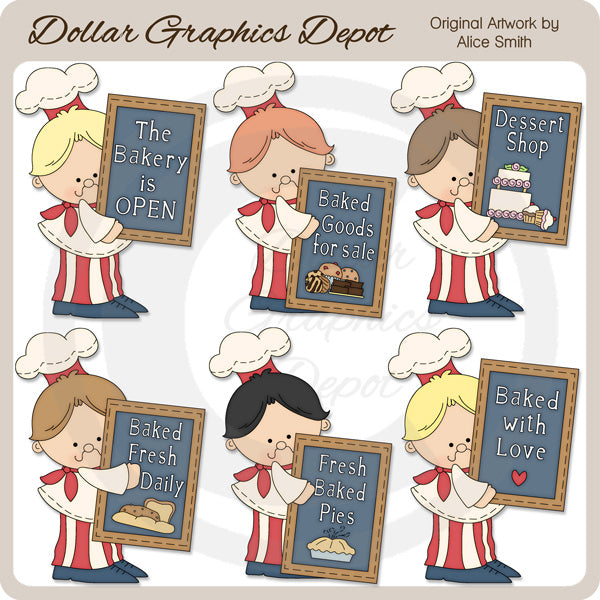 Questa collezione unica nel suo genere è disponibile solo presso Digital Craft Supplies. Questo set comprende sei pasticceri, ciascuno con cartelli: uno con la scritta "La panetteria è aperta", uno con biscotti, brownies, muffin e "Prodotti da forno in vendita", uno con una torta a strati, cupcakes e Word art "Dessert Shop", uno con pane appena sfornato e word art "Baked Fresh Daily", uno con una torta al forno e word art "Fresh Baked Pies" e uno con un cuoricino rosso e word art "Baked With Love" . Questo set esclusivo contiene 6 grafiche.