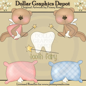 Questa collezione include due orsetti della fatina dei denti, ciascuno con ali da fata, una bacchetta magica a forma di stella e un dente, due soffici cuscini con un dente sotto ciascuno e una grafica word art "Fatina dei denti". Questo set contiene 5 grafici.