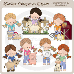 Questa collezione unica nel suo genere è disponibile solo presso Digital Craft Supplies. Questa collezione comprende sette adorabili contadine, una gallina nel nido, un secchio pieno di uova, un prato, graziosi fiori, una staccionata, una pecora, una gallina, un mucchio di fieno, un fienile rosso, un forcone, una capra, un maiale, un'anatra e una mucca maculata. Questo set esclusivo contiene 7 grafiche.