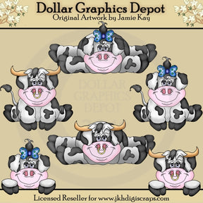 Questa collezione comprende tre adorabili mucche maculate, con graziosi fiocchi per capelli, e tre adorabili mucche maculate (tori). Questo set contiene 6 grafici.