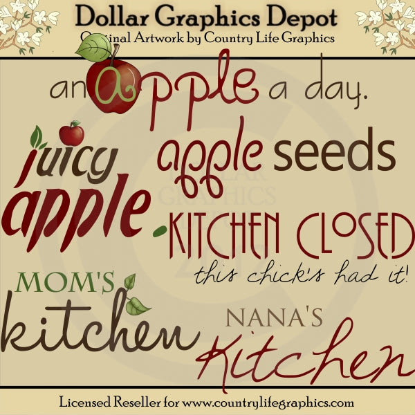Questa raccolta include dodici grafiche word art con mele (bonus incluso): "An Apple A Day", "Apple Seeds", "Juicy Apple", "Kitchen Closed - This Chick's Had It", "Mom's Kitchen" e "Nana's Kitchen". " BONUS: questa raccolta include sei grafica word art nera abbinata (non mostrata). Questo set contiene 12 grafici.