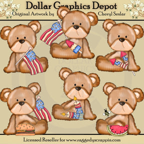 Questa collezione comprende sei graziosi orsacchiotti, bandiere americane, petardi, un ghiacciolo rosso, bianco e blu, un cheeseburger, una fetta di anguria e un piccolo calabrone. Questa collezione grafica è stata creata utilizzando una speciale tecnica di colorazione che esalta l'ombreggiatura e la trama della grafica. Sono davvero carini...e unici! Questo set contiene 6 grafici.