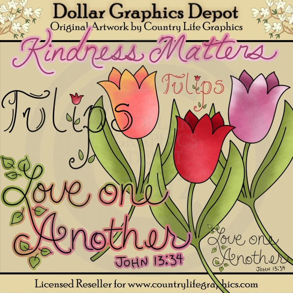 Questa raccolta include bellissimi tulipani corallo, rossi e viola e cinque graziose grafiche word art: (1) "La gentilezza conta", (2) "Tulipani" e (2) "Amatevi gli uni gli altri... Giovanni 13:34. " Questo set contiene 8 grafici.