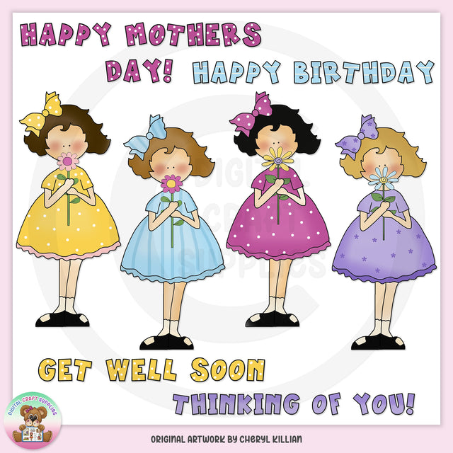 Questa collezione include quattro graziose mamme, che indossano graziosi abiti fantasia e fiocchi per capelli abbinati, ognuna con in mano un bel fiore, e quattro parole artistiche con sentimenti: "Buona festa della mamma", "Buon compleanno", "Guarisci presto" e "Ti penso". ." Questo set contiene 8 grafici.