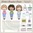 Questa ampia collezione comprende tre adorabili mamme incinte, una culla, un vestito da bambina, una tuta da neonato, tre biberon, un pacchetto di pannolini, un tubo di crema per pannolini, salviette per pannolini, shampoo per neonati, coperte per bambina e coperte per neonato. Questo set contiene 15 grafici.
