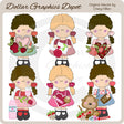 Questa collezione unica nel suo genere è disponibile solo presso Digital Craft Supplies. Questa collezione comprende dolci bambine di San Valentino con rose rosa e rosse, cuori di San Valentino smerlati, un biglietto di San Valentino in una busta, una scatola di cioccolatini a forma di cuore, una bottiglia di limonata frizzante, un bicchiere di limonata frizzante, caramelle di San Valentino avvolte, ricoperte di cioccolato fragole, tartufi al cioccolato, cuori di conversazione e una simpatica scimmietta. Questo set esclusivo contiene 6 grafiche.