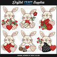 Questa collezione comprende sei adorabili coniglietti di San Valentino con tanti cuori di San Valentino, mazzi di fiori a forma di cuore, graziose rose rosse, tartufi di cioccolato e un biglietto di San Valentino in una busta. Questo set contiene 6 grafici.