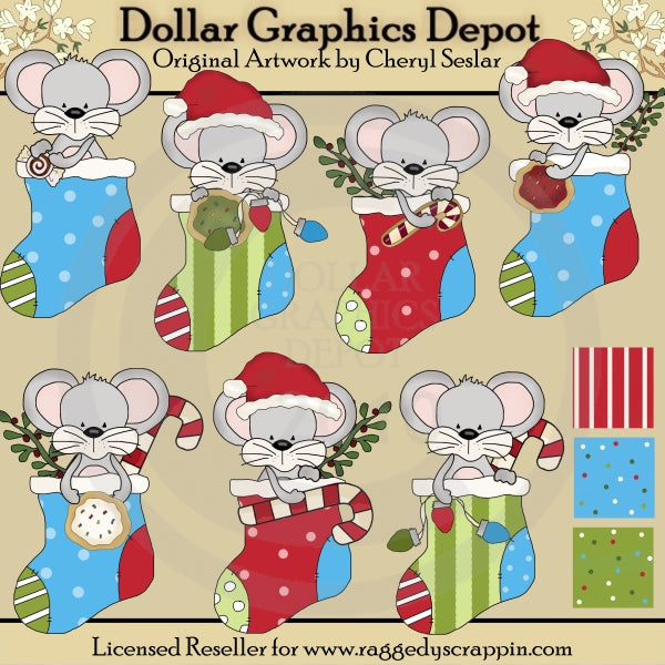 Questa collezione unica nel suo genere è disponibile solo presso Digital Craft Supplies. Questo set include sette topolini, seduti all'interno di calze natalizie a pois e a righe, in rosso, verde, blu e bianco, cappelli di Babbo Natale, luci natalizie, rami di bacche di agrifoglio, caramelle alla menta piperita, biscotti natalizi decorati, bastoncini di zucchero e tre sfondi coordinati . Questo set esclusivo contiene 10 grafiche.