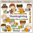 Questa vasta collezione comprende adorabili ragazzi e ragazze del Ringraziamento con cappelli da pellegrino, zucche, girasoli, foglie autunnali colorate, un tacchino, pannocchie di mais, una torta di zucca, un topolino, una cornucopia piena di frutta, una ciotola di purè di patate e cinque grafica word art: "We Are Blessed", "Ringraziamento", "Gobble Till Ya Wobble", "Our Feast" e "You Are A Blessing". Questo set contiene 14 grafici.