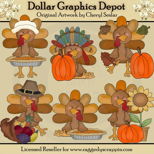 Questa collezione comprende sei adorabili tacchini del Ringraziamento, cappelli da pellegrino, un colorato copricapo indiano, torte di zucca appena sfornate, zucche autunnali, una pianta di girasole, foglie autunnali colorate e una cornucopia piena di frutti autunnali. Questo set contiene 6 grafici.