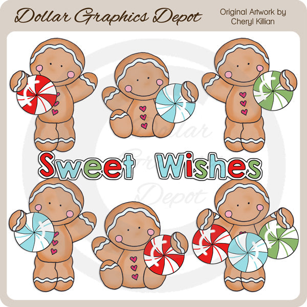 Questa collezione include adorabili omini e signore di pan di zenzero con caramelle alla menta piperita e una grafica word art "Sweet Wishes". Questo set contiene 6 grafici.