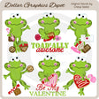 Questa collezione comprende sei adorabili rane di San Valentino, biscotti di San Valentino a forma di cuore, un cuore di conversazione, caramelle di San Valentino avvolte, rose rosa e rosse, un biglietto di San Valentino in una busta, tartufi di cioccolato, fragole ricoperte di cioccolato e due grafiche word art di San Valentino: "Rospo" alleato Fantastico" e "Be My Valentine". Questo set contiene 8 grafici.