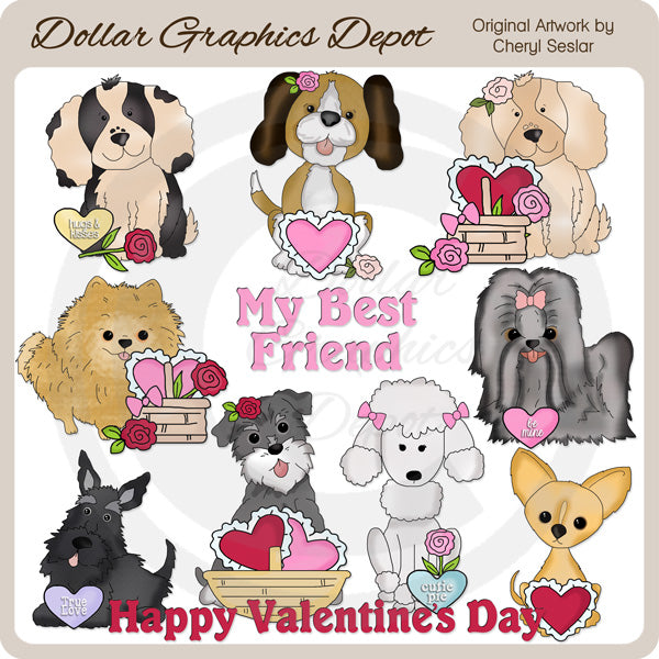 Questa collezione unica nel suo genere è disponibile solo presso Digital Craft Supplies. Questa collezione include adorabili cuccioli di San Valentino con cuori rossi e rosa smerlati, graziose rose rosse e rosa, cuori di conversazione, cestini intrecciati con fiocchetti e due grafiche word art di San Valentino: "Il mio migliore amico" e "Buon San Valentino". Questo set esclusivo contiene 11 grafiche.