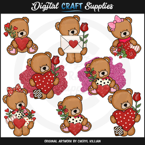 Questa collezione comprende otto adorabili orsetti di San Valentino (due con sfondi piuttosto scintillanti), tanti cuori di San Valentino, graziosi fiori rossi, un biglietto di San Valentino in una busta e tartufi di cioccolato. Questo set contiene 8 grafici.