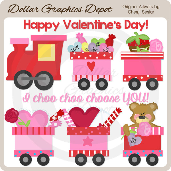 Questa collezione include un trenino choo-choo di San Valentino in sei pezzi con cuori di conversazione, caramelle di San Valentino avvolte, una fragola ricoperta di cioccolato, rose rosa, una rosa rossa, cuori smerlati rosa e rossi, un biglietto di San Valentino in una busta, un trenino imbottito orsacchiotto e due grafiche word art di San Valentino: "Buon San Valentino" e "I Choo Choo Choose You". Questo set contiene 8 grafici.