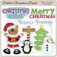 Questa collezione include un simpatico orso vestito con un costume da Babbo Natale, un piccolo pinguino con cuffie antirumore, un pupazzo di neve con cuffie antirumore, un pino innevato con una stella dorata in cima, un cartello "Polo Nord" e tre grafiche natalizie - " Auguri di Natale", "Buon Natale" e "Auguri di buone feste". Questo set contiene 8 grafici.