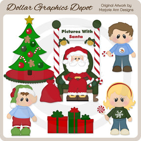 Questa collezione include Babbo Natale seduto su una sedia con un bastoncino di zucchero e un sacco pieno di giocattoli, un cartello a strisce con ornamenti natalizi e la scritta "Immagini con Babbo Natale", un albero di Natale decorato con una graziosa gonna da albero, un simpatico elfo, un ragazzino con un bastoncino di zucchero, una bambina con un lecca-lecca alla menta e regali di Natale avvolti con graziosi fiocchi. Questo set contiene 7 grafici.