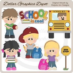 Questa collezione include adorabili ragazzi e ragazze, libri scolastici, una mela rossa, una matita, zaini, un cartello "Fermata dell'autobus", uno scuolabus con autista e una grafica word art "School Is Cool". Questo set contiene 7 grafici.