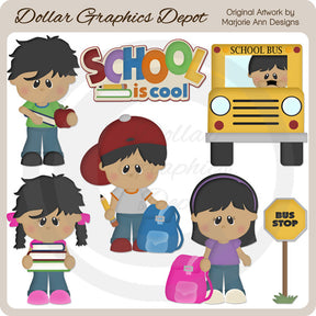 Questa collezione include adorabili ragazzi e ragazze, libri scolastici, una mela rossa, una matita, zaini, un cartello "Fermata dell'autobus", uno scuolabus con autista e una grafica word art "School Is Cool". Questo set contiene 7 grafici.