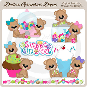 Questa collezione include adorabili orsetti con una macchina per palline di gomma, palline di gomma, un barattolo pieno di caramelle assortite, una caramella alla menta, un cupcake glassato con confettini e una ciliegia, un tartufo al cioccolato, un frappè con panna montata, cannucce e una ciliegia , cannucce, una scritta grafica "Sweet On You" e un bordo di caramelle assortito. Questo set contiene 6 grafici.