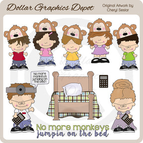 Questa collezione include cinque bambini con graziosi cappellini da scimmietta, la mamma con una calcolatrice, il dottore con una lampada frontale e una calcolatrice, un letto con coperta e cuscino, una calcolatrice, un fumetto con i commenti "Mai più scimmie che saltano sul letto", e una grafica in word art "No More Monkeys Jumpin On The Bed". Questo set contiene 11 grafici.