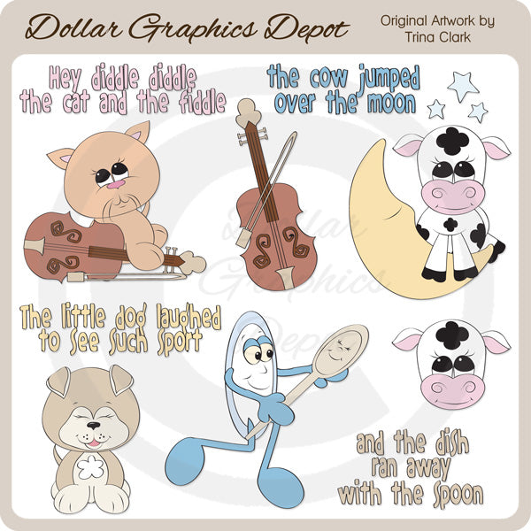 Questa collezione include un gatto con un violino, una mucca che salta sopra la luna con piccole stelle, un cane, un piatto che corre con un cucchiaio, una faccia di mucca, un violino e grafica con quattro parole: "Hey Diddle Diddle The Cat And The Violino", "La mucca saltò sopra la luna", "Il cagnolino rise vedendo questo sport" e "E il piatto scappò con il cucchiaio". NOTA BENE: questo set si coordina con la collezione "Hey Diddle Diddle - Scrap Papers" . Questo set contiene 10 grafici.