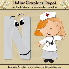 Questa raccolta include file di taglio che possono essere utilizzati per creare questo progetto educativo con lettere dell'alfabeto (mostrato "finito" in anteprima) – N sta per Infermiera: la lettera "N" e una dolce piccola infermiera.