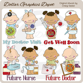 Questa collezione unica nel suo genere è disponibile solo presso Digital Craft Supplies. Questa ampia collezione comprende otto adorabili neonati e bambine con una lampada frontale, un adesivo con la scritta "Il mio dottore visita", lecca-lecca, una benda, un'iniezione, un adesivo con la scritta "I Hate Shots", un cappello di pronto soccorso, un termometro, flaconi di sciroppo per la tosse, una scatola di fazzoletti, uno stetoscopio, un flacone di prescrizione, un kit di pronto soccorso, una cartella clinica, un adesivo con la scritta "Brave Little Fella" e una grafica con quattro parole: "La mia visita dal dottore, ""Guarisci presto", "Futura infermiera" e "Futuro dottore". Questo set esclusivo contiene 12 grafiche.