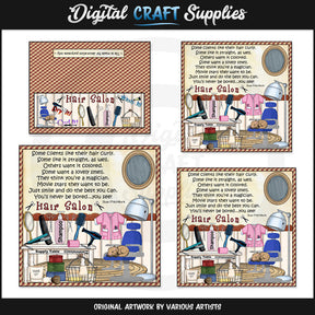 Questa collezione unica nel suo genere è disponibile solo presso Digital Craft Supplies. Questa collezione include un blocco di vetro standard stampabile (adatto a un blocco di vetro da 8" x 8"), un mini blocco di vetro stampabile (adatto a un blocco di vetro mini da 6" x 6"), una piastrella di ceramica stampabile (adatto a un blocco di vetro da 4" x 4") piastrelle di ceramica) e un topper per sacchetti di piastrelle di ceramica (ideale per esporre le piastrelle di ceramica decorate da 4" x 4" durante fiere dell'artigianato, mostre di artigianato e negozi di articoli da regalo). Queste immagini raffigurano un salone di parrucchiere con una postazione per parrucchiere, un tavolo per le scorte, specchi, una piastra per capelli, un pettine, forbici, shampoo, un rullo, una spazzola, un asciugacapelli, una forcina, un kit da barba, cappelliere, un un cestino di filo metallico pieno di asciugamani, un grembiule da parrucchiere, una sedia con asciugacapelli, un gattino e una poesia da parrucchiere. Questo set esclusivo contiene 4 stampabili individuali e 4 pagine "Pronte per la stampa" (non mostrate nell'anteprima).