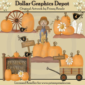 Questa collezione include tantissime zucche nel campo delle zucche, una ruota di carro vecchio stile, una staccionata bianca, corvi neri con ali a forma di cuore, un simpatico spaventapasseri, un cartello con la scritta "Scegli il tuo", un carro di legno pieno di zucche e un cartello con la scritta "Zucche", graziosi fiori di margherite e un cartello di benvenuto "Pumpkin Patch". Questo set contiene 5 grafici.