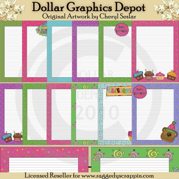 Questa collezione comprende dodici fogli di cancelleria per compleanno, in verde, rosa, blu e viola, con strisce, pois, incroci, turbinii di coriandoli, graziosi cupcakes con candele e un orsacchiotto con cappello da festa. Quattro fogli hanno una scritta che recita: "Auguri di compleanno", "Buon compleanno" e "Dolci auguri". Questo set contiene 12 fogli di cancelleria.