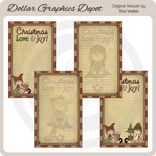 Questa collezione comprende quattro fogli di cancelleria da 5" x 8", raffiguranti graziose bambine di Natale, parole artistiche "Christmas Love & Joy", regali di Natale incartati, topi di peluche, una calza di Natale, bastoncini di zucchero e un albero di Natale. NOTA BENE: questo set è coordinato con "Christmas Girls 4 - Clip Art", "Christmas Girls 4 - Cards", "Christmas Girls 4 - Tags", "Christmas Girls - 4 Labels", "Christmas Girls 4 - Cupcake Wrappers" "Ragazze di Natale 4-5 - Scrap Papers", "Ragazze di Natale 5 - Clip Art", " Ragazze di Natale 5 - Cartoline", "Ragazze di Natale 5 - Etichette", " Ragazze di Natale 5 - Etichette", "Ragazze di Natale 5 - Cupcake Involucri", "Christmas Girls 5 - Buste per buoni regalo" e "Christmas Girls 5 - Cartoleria" . Questo set contiene 4 fogli di cancelleria stampabili.