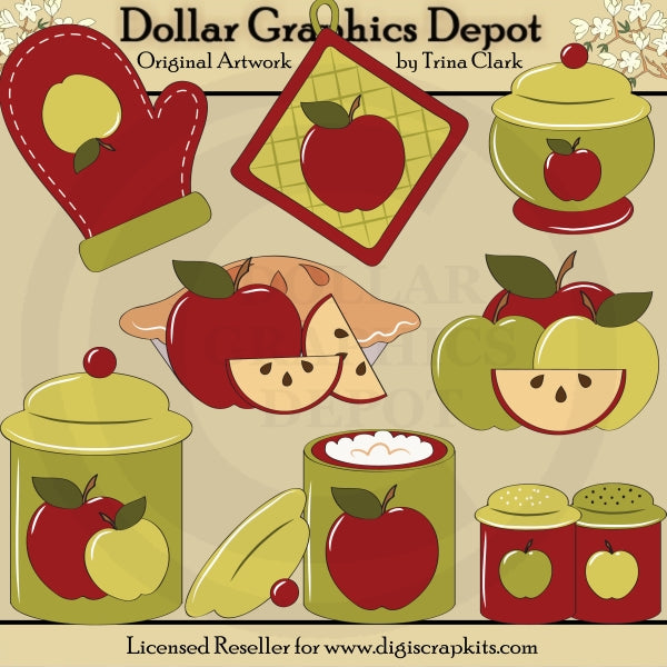 Questa collezione include una torta di mele, una mela rossa e fette di mela, mele verdi e rosse e una fetta di mela, un guanto da forno, una presina, una zuccheriera, un contenitore per la farina, un contenitore per lo zucchero e un contenitore per sale e pepe . Questo set contiene 8 grafici.