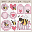 Questa collezione include un'etichetta smerlata con un calabrone e cuoricini, un'etichetta a forma di cuore con un calabrone, un'etichetta smerlata con un cuore, un'etichetta smerlata con la scritta "Bee Mine" e cuoricini, un'etichetta smerlata vuota (per da personalizzare), un'etichetta tradizionale con un cuore, un'etichetta tradizionale con un calabrone e cuoricini, un calabrone, un cuore a pois e una grafica word art "Bee Mine". Questo set contiene 10 grafici.